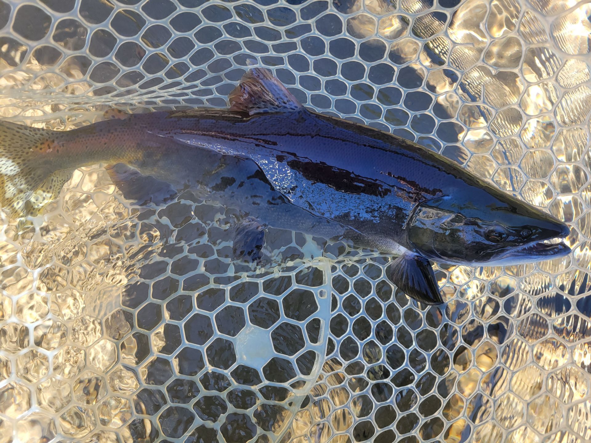 As we looked closer through at the water, especially from the right vantage points above the water, we could see there were tons of Kokanee salmon, which are “landlocked Sockeye salmon”. They fight their way upstream to spawn and lay eggs but they were early this year . Their entire body changes colors to bright red, yellow, and greens, and you could see them easily the more we paid attention. They’d span 20 inches or more and really stand out. While they typically don’t eat during the spawn, they were early and we were excited to get lines in the water and see if they’d hit it. After a few trout and whitefish, I finally got a hit, fought and let the Kokanee take the line, worried it would slip off the line as they apparently are known to rub the hooks off against the actual “sheep bridge” along the water - this wooden structure that was no longer in use. After some time, I finally pulled in my first Kokanee. All of us managed to have a good day with maybe 20 or so that we brought into our net (all catch and release).